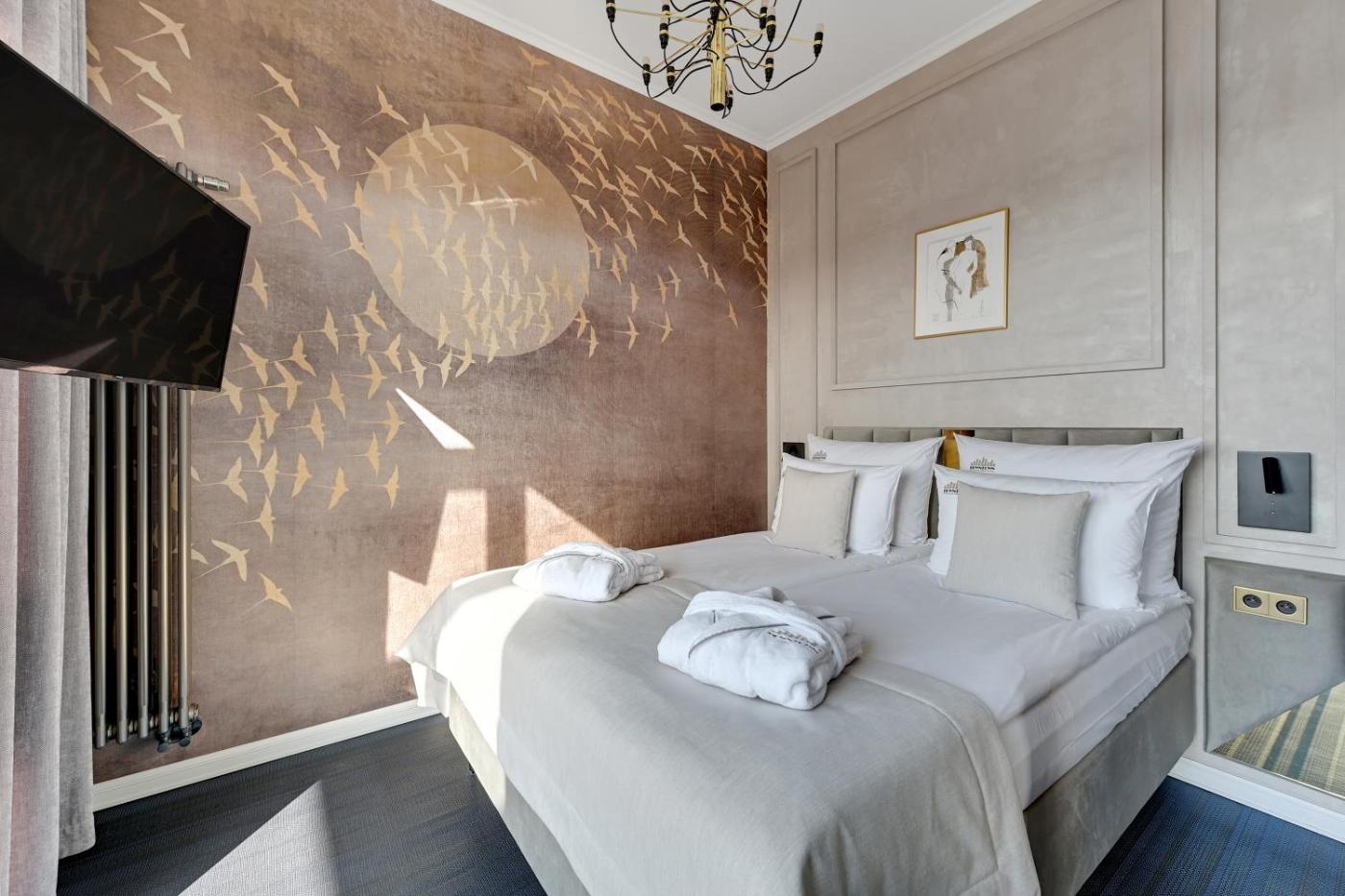 Apartament typu Deluxe Suite. Ten apartament typu suite z oddzielnym wejściem mieści salon, oddzielną sypialnię oraz łazienkę z prysznicem i suszarką do włosów. Udogodnienia obejmują doskonale wyposażony aneks kuchenny z płytą kuchenną, lodówką, zmywarką do naczyń i przyborami kuchennymi. Apartament ma podłogę wyłożoną parkietem i dźwiękoszczelne ściany. Do dyspozycji Gości jest część wypoczynkowa z telewizorem z płaskim ekranem i dostępem do kanałów kablowych, pralka oraz zestaw do parzenia kawy i herbaty. W tej opcji zakwaterowania zapewniono 2 łóżka. Apartament typu Suite - 5 osobowy. Powierzchnia pokoju ok.: 40 mkw. ;