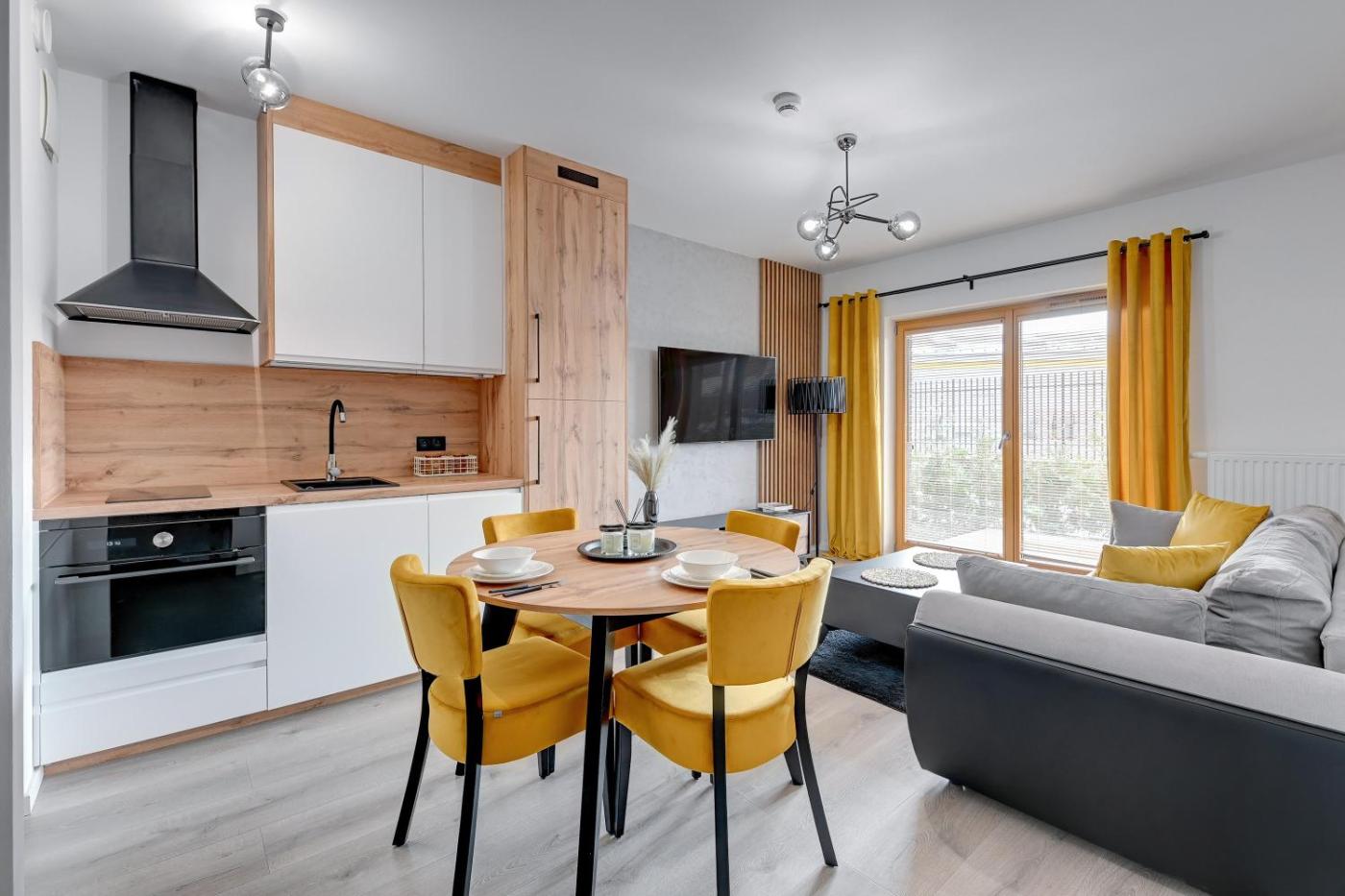 Apartament z 1 sypialnią. Ten apartament z oddzielnym wejściem mieści salon, oddzielną sypialnię oraz łazienkę z prysznicem i suszarką do włosów. Udogodnienia obejmują w pełni wyposażony aneks kuchenny z płytą kuchenną, lodówką, zmywarką do naczyń i przyborami kuchennymi. Apartament ma dźwiękoszczelne ściany. Do dyspozycji Gości jest balkon, zestaw do parzenia kawy i herbaty oraz telewizor z płaskim ekranem i dostępem do kanałów kablowych. W tej opcji zakwaterowania zapewniono 2 łóżka. Apartament - 5 osobowy. Powierzchnia pokoju ok.: 42 mkw. ;