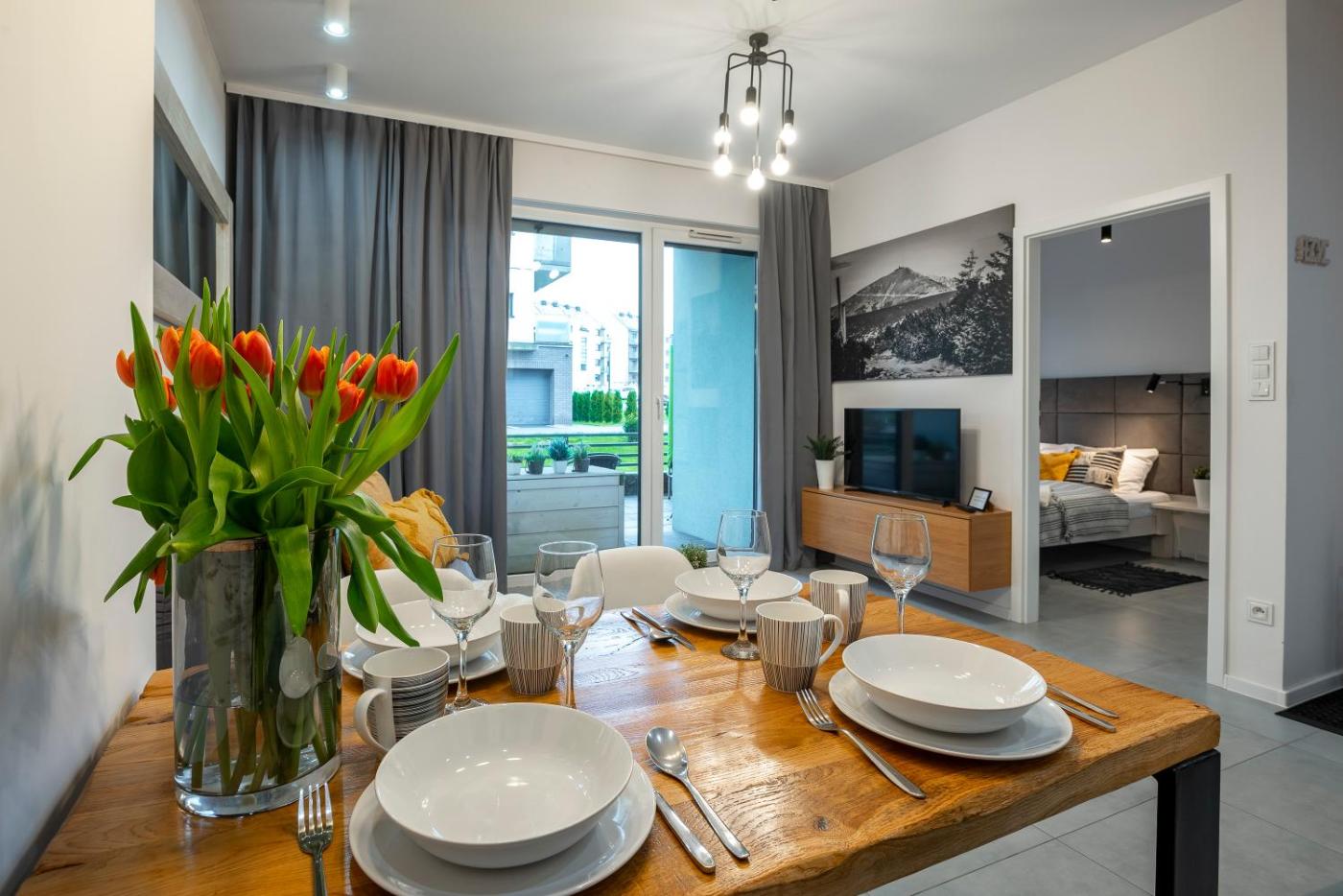 Apartament z tarasem. This apartment comes with 1 living room, 1 separate bedroom and 1 bathroom with a walk-in shower and free toiletries. In the kitchen, guests will find a stovetop, a refrigerator, a dishwasher and kitchenware. Boasting a terrace with mountain views, this apartment also features a washing machine and a flat-screen TV with cable channels. The unit has 2 beds. Apartament - 4 osobowy. Powierzchnia pokoju ok.: 37 mkw.