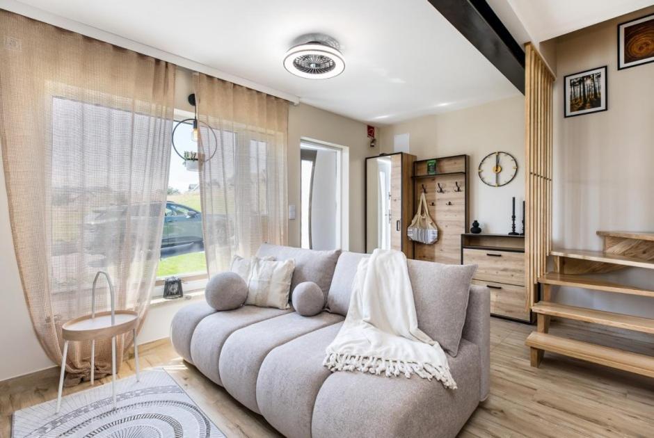 Dom z 2 sypialniami. This holiday home offers a fireplace. Featuring a private entrance, this holiday home comprises 1 living room, 2 separate bedrooms and 1 bathroom with a shower and a hairdryer. Meals can be prepared in the kitchen, which comes with a stovetop, a refrigerator, a dishwasher and kitchenware. Boasting a terrace with lake views, this holiday home also provides soundproof walls and a flat-screen TV. The unit offers 3 beds. Dom wakacyjny - 6 osobowy. Powierzchnia pokoju ok.: 80 mkw. ;
