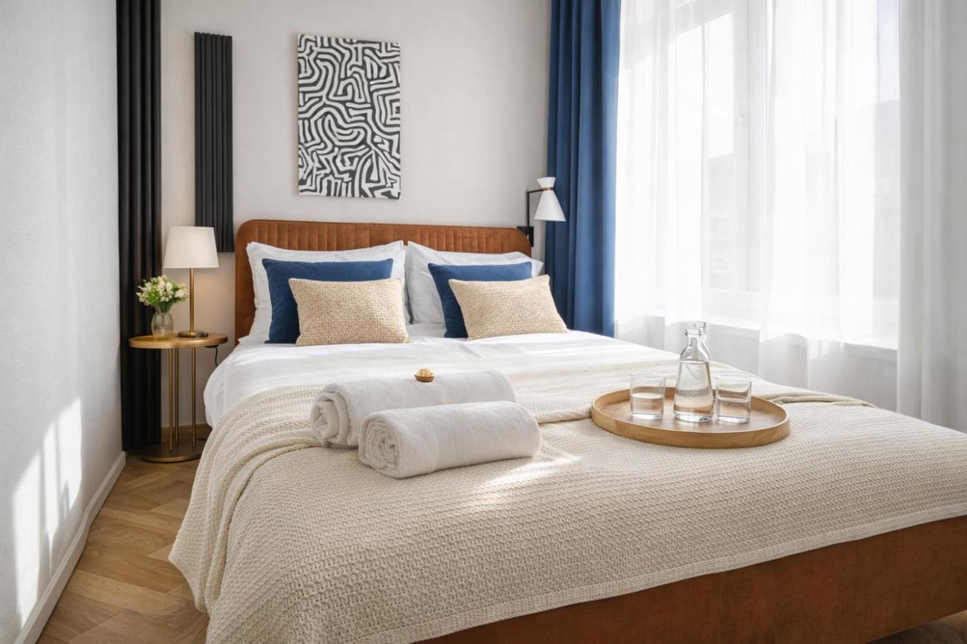 Apartament typu Deluxe z 1 sypialnią i widokiem na miasto. This apartment comprises 1 living room, 1 separate bedroom and 1 bathroom with a walk-in shower and free toiletries. Meals can be prepared in the kitchenette, which comes with a stovetop, a refrigerator, a dishwasher and kitchenware. The air-conditioned apartment provides a flat-screen TV with streaming services, soundproof walls, a tea and coffee maker, a seating area as well as city views. The unit offers 3 beds. Powierzchnia pokoju ok.: 40 mkw.