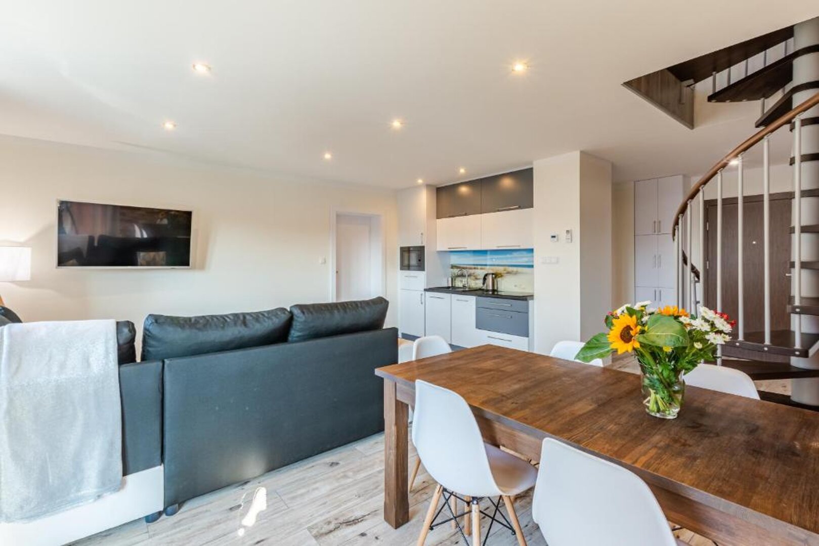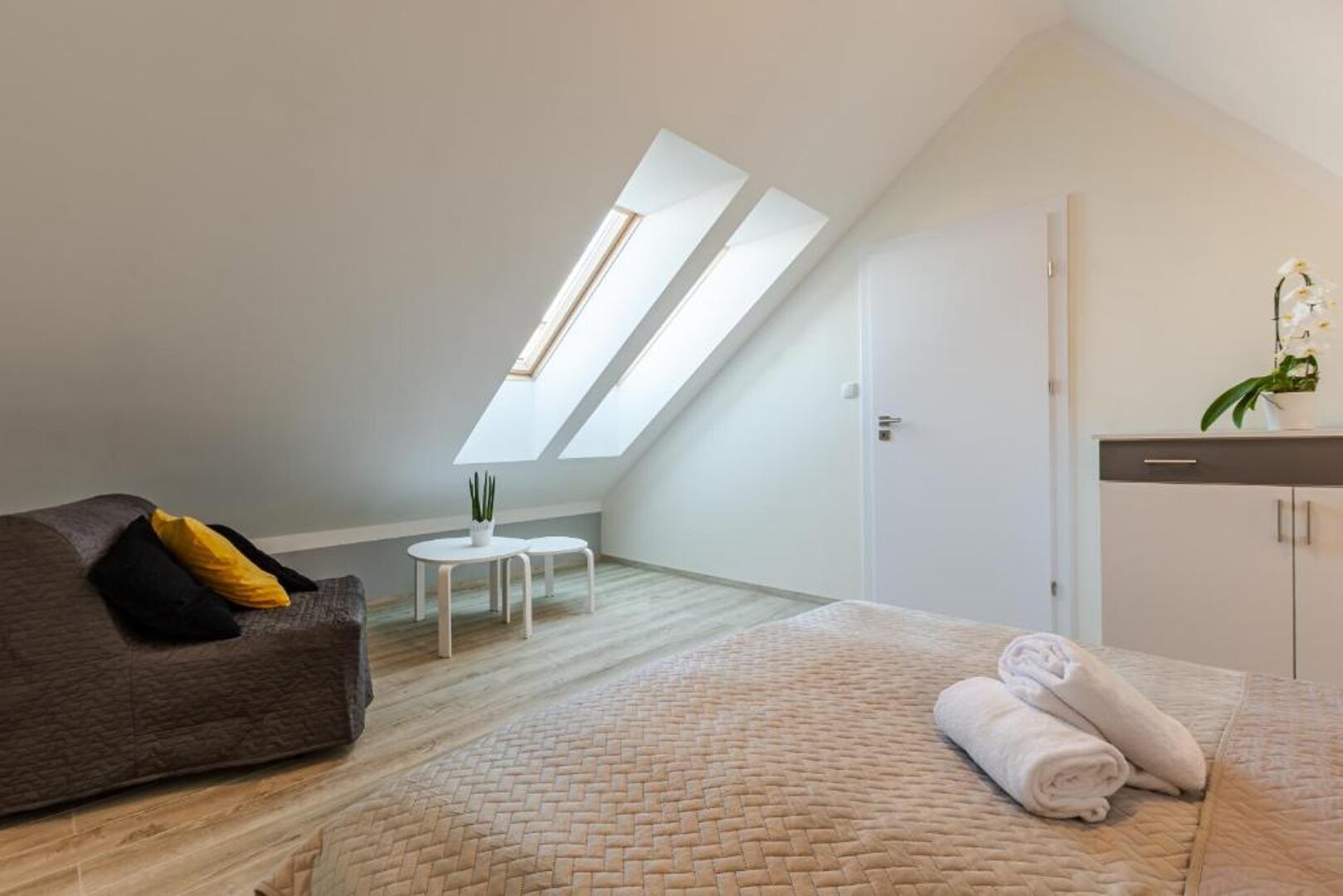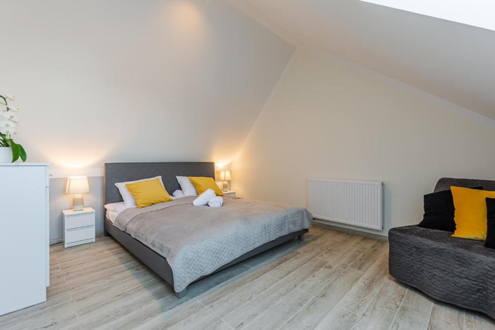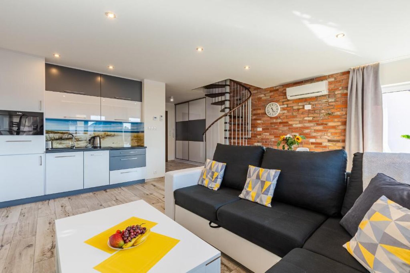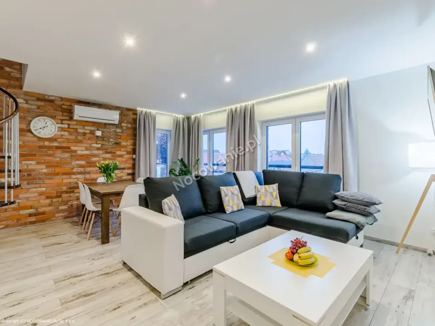Przestronny apartament dwupoziomowy dla 7 osób z balkonem – Apartt 99, Łeba Zapraszamy do komfortowego, nowoczesnego apartamentu dwupoziomowego o imieniu Isla, który pomieści aż 7 osób. Zlokalizowany w prestiżowej inwestycji Apartt 99 w Łebie, apartament ten jest doskonałą propozycją dla większych rodzin lub grup przyjaciół szukających przestrzeni, wygody i idealnej lokalizacji – blisko plaży, głównego deptaka oraz nadmorskich atrakcji. Apartament o powierzchni ok. 70 m² został zaprojektowany z myślą o wygodnym wypoczynku większej liczby gości, łącząc nowoczesny styl z funkcjonalnymi rozwiązaniami. Układ i wyposażenie apartamentu: Na dolnym poziomie znajduje się jasny salon z dużą, rozkładaną sofą, która może służyć jako miejsce do spania dla 2 osób. W salonie znajduje się również strefa wypoczynkowa z telewizorem oraz wyjście na przestronny balkon, idealny na poranną kawę lub wieczorny relaks. Obok salonu mieści się w pełni wyposażony aneks kuchenny z częścią jadalnianą. Kuchnia zawiera: Na tym poziomie znajduje się także nowoczesna łazienka z kabiną prysznicową, deszczownicą, pralką oraz suszarką do włosów. Na piętrze usytuowane są dwie oddzielne sypialnie: jedna z łóżkiem małżeńskim, druga z dwoma łóżkami pojedynczymi, dodatkowo znajduje się tam druga łazienka, co znacząco podnosi komfort przy większej liczbie gości. Udogodnienia i dodatkowe atuty: Klimatyzacja na obu poziomach, Bezpłatne Wi-Fi, Nowoczesne, eleganckie wnętrze z dbałością o detale, Bliskość morza, oceanarium, restauracji, sklepów i głównych atrakcji Łeby. To idealne miejsce na wspólny urlop nad morzem – komfortowy apartament, świetna lokalizacja i kompleksowe wyposażenie sprawiają, że poczują się tu Państwo jak w domu.