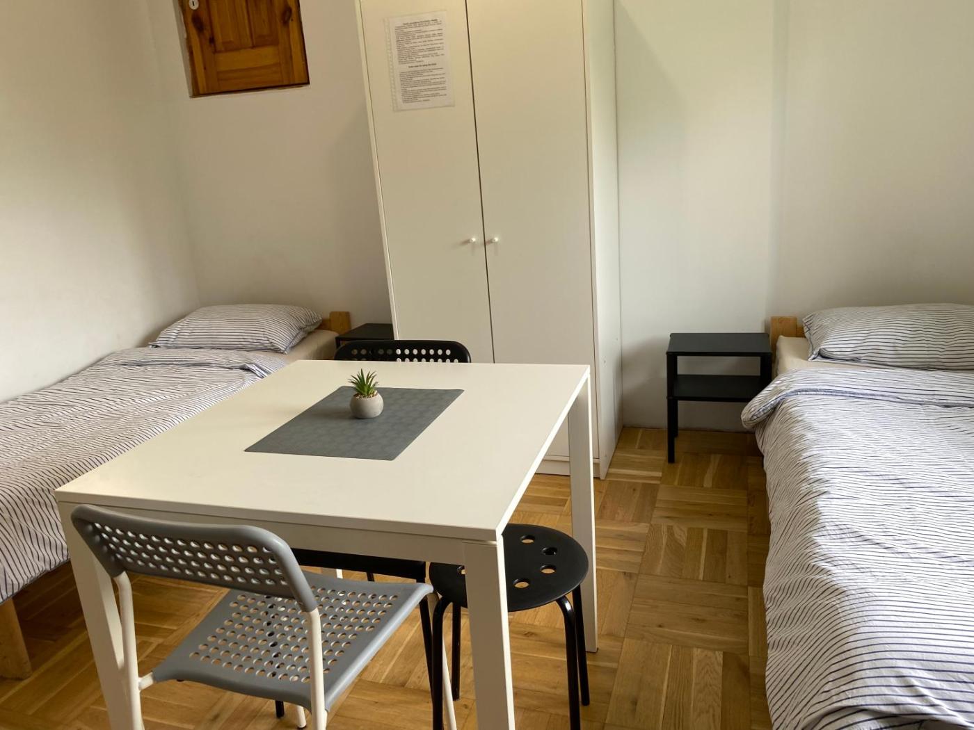 Pokój z 2 łóżkami pojedynczymi i balkonem. The twin room features a dining area, a wardrobe, a balcony with garden views as well as a shared bathroom boasting a shower. The unit has 2 beds. Pokój z 2 łóżkami pojedynczymi - 2 osobowy. ;