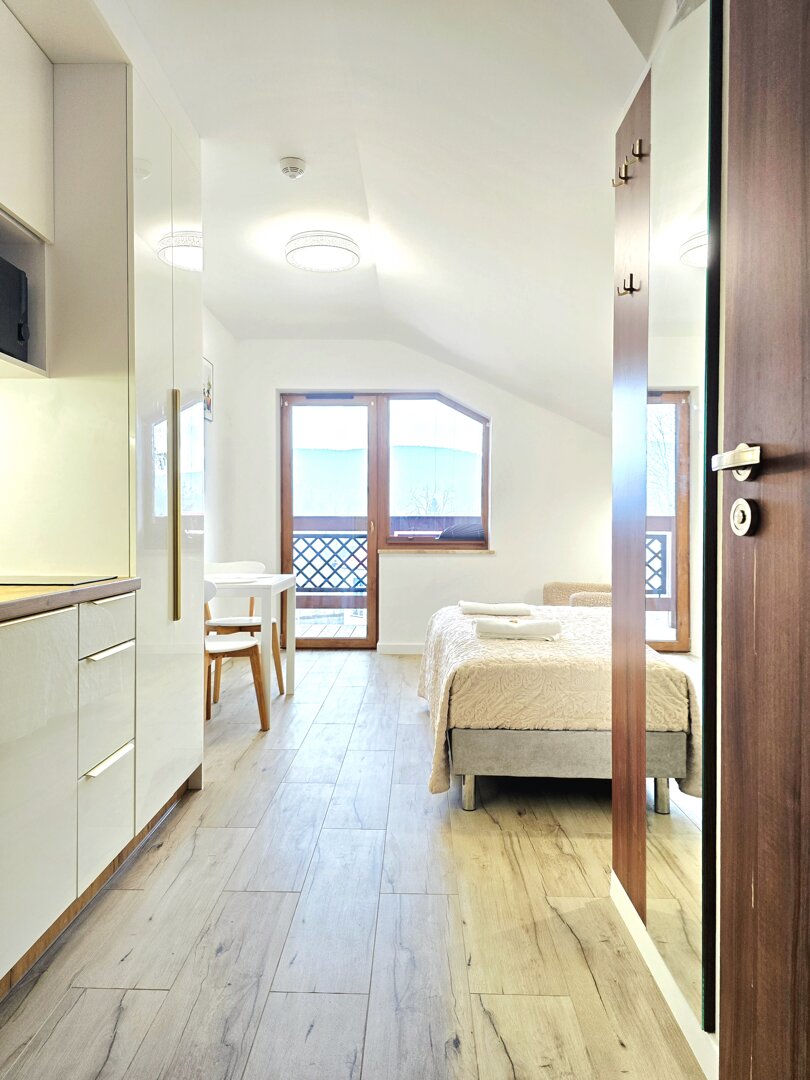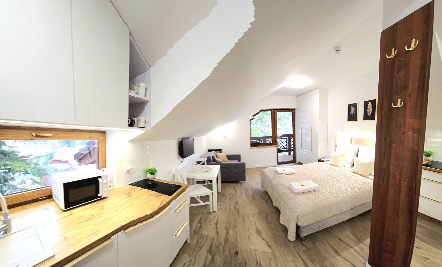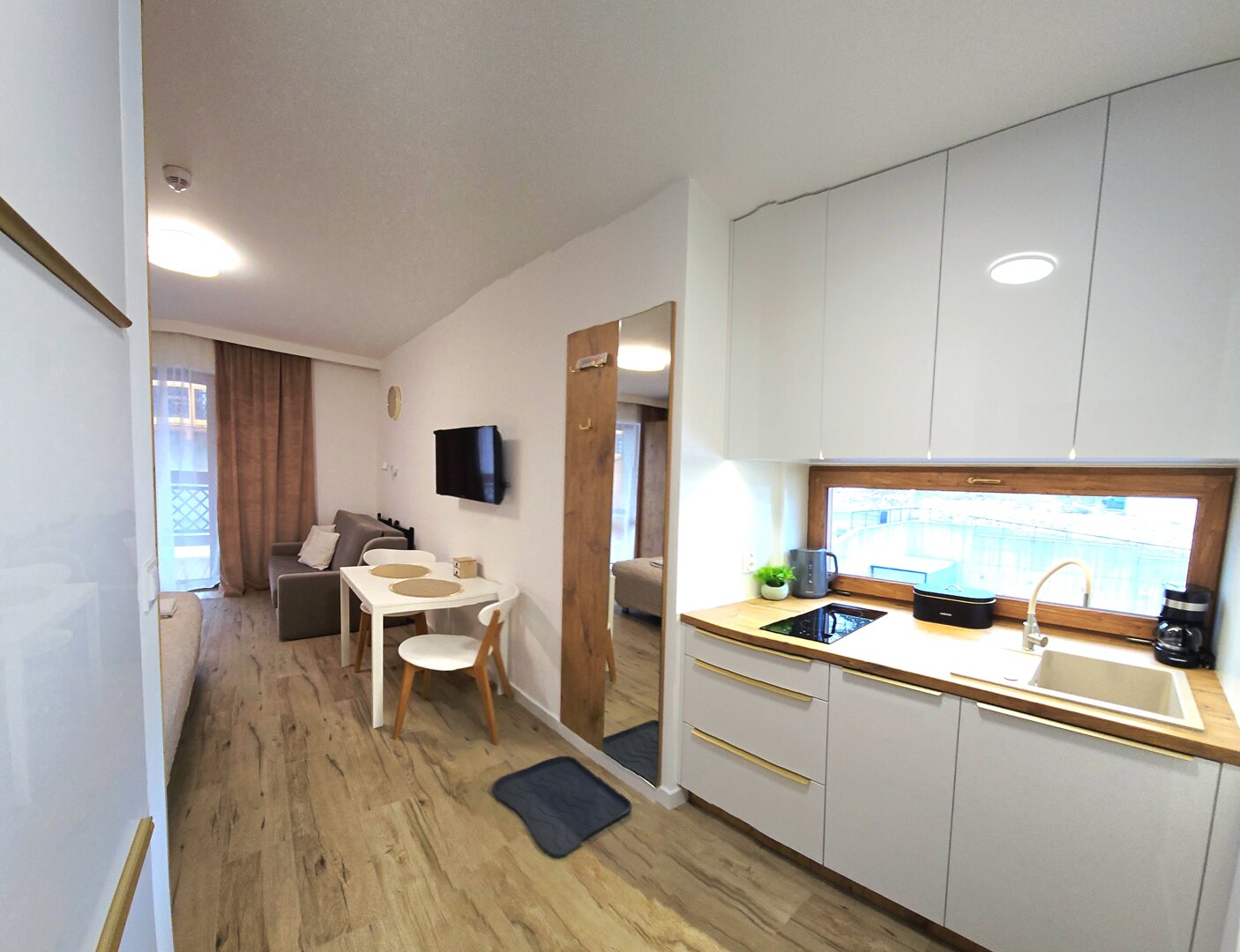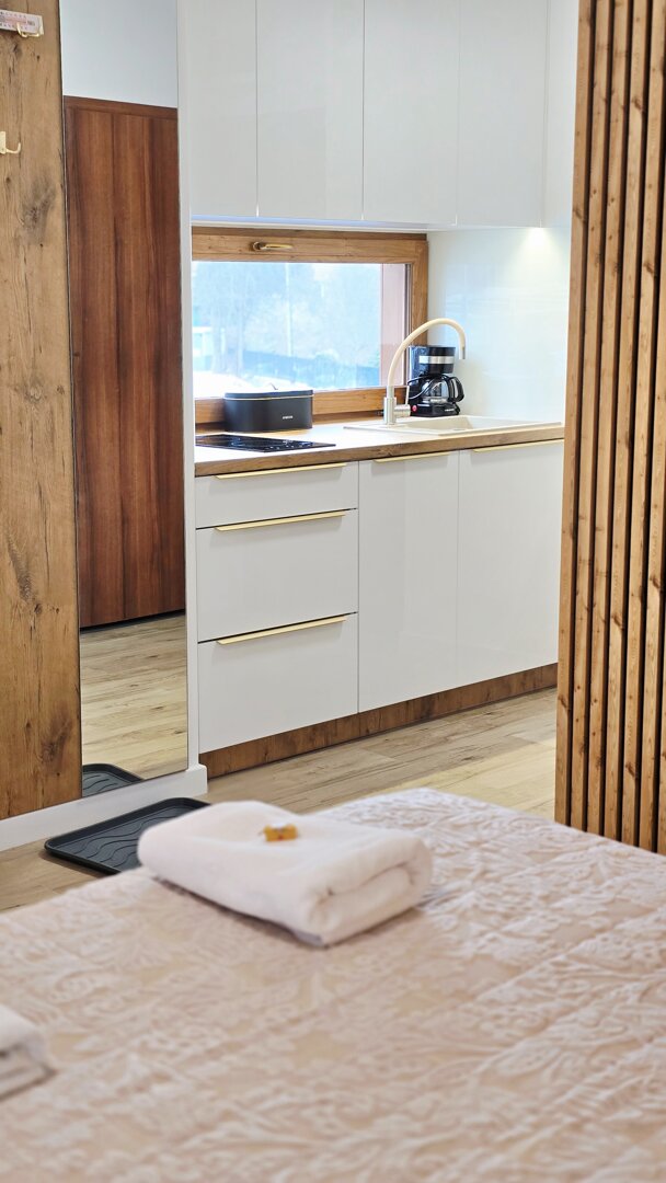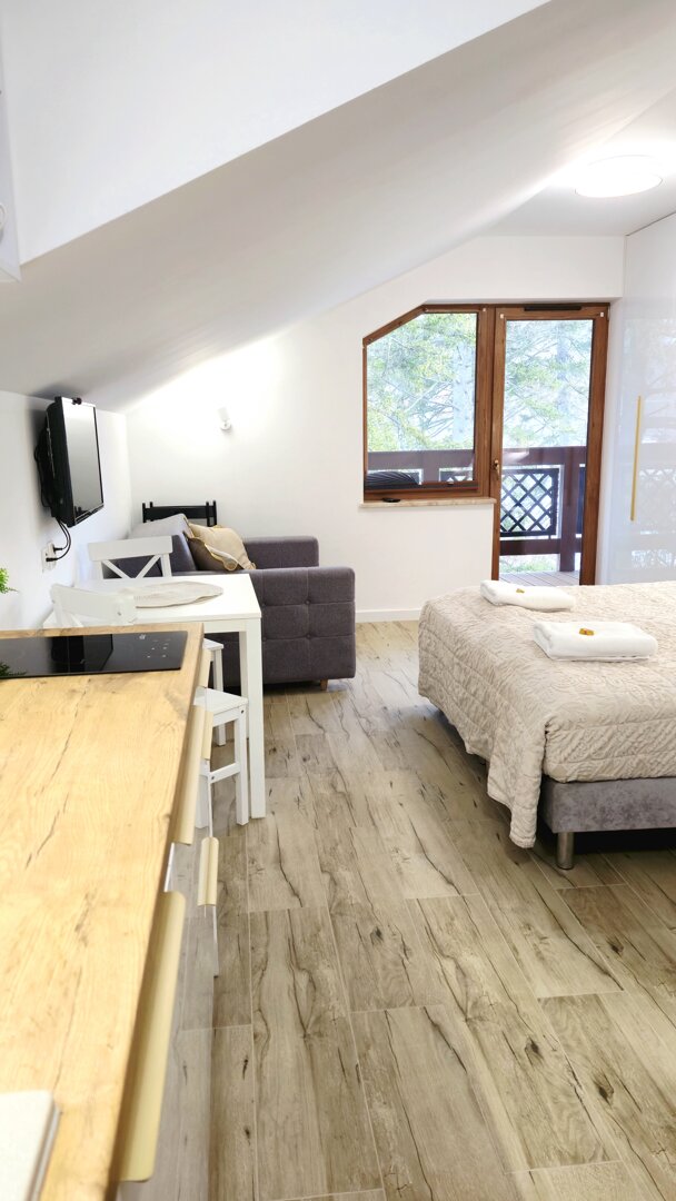 Klimatyczny apartament z widokiem na zieloną część posesji wewnętrznej - świerki, strumyk, zieleń. Opis Apartamentu: Lokalizacja: Apartament znajduje się w malowniczym mieście Szklarska Poręba, otoczonym majestatycznymi szczytami Karkonoszy. Idealne miejsce dla miłośników górskich wycieczek i pięknych widoków. W centrum miasta. Pomieszczenie: Otwarty pokój z aneksem kuchennym: Pokój: W centrum znajduje się stół oraz krzesła, telewizor, sprzęt do prasowania, odkurzacz. Aneks kuchenny: W pełni wyposażony w sprzęty AGD oraz sprzęt do przygotowania posiłków, kafeterka właska, ekspres przelewowy. Szafki i blat oferują dużo miejsca na przechowywanie i przygotowywanie posiłków. Część sypialnia główna: sypialnia z wygodnymi łóżkami pojedynczymi zestawionymi, szafkami nocnymi i przestronną szafą oraz rozkładana sofa, na której zmieści się 1 osoba dorosła lub 2 dzieci do 12 lat. Wystrój utrzymany w ciepłych, relaksujących kolorach. Łazienka: Nowoczesna łazienka z dużym prysznicem, umywalką, lustrem i toaletą. Dodatkowe udogodnienia: Przechowalnia rowerów czy sprzętu narciarskiego w budynku. Parking: Miejsce parkingowe dla mieszkańców apartamentu.