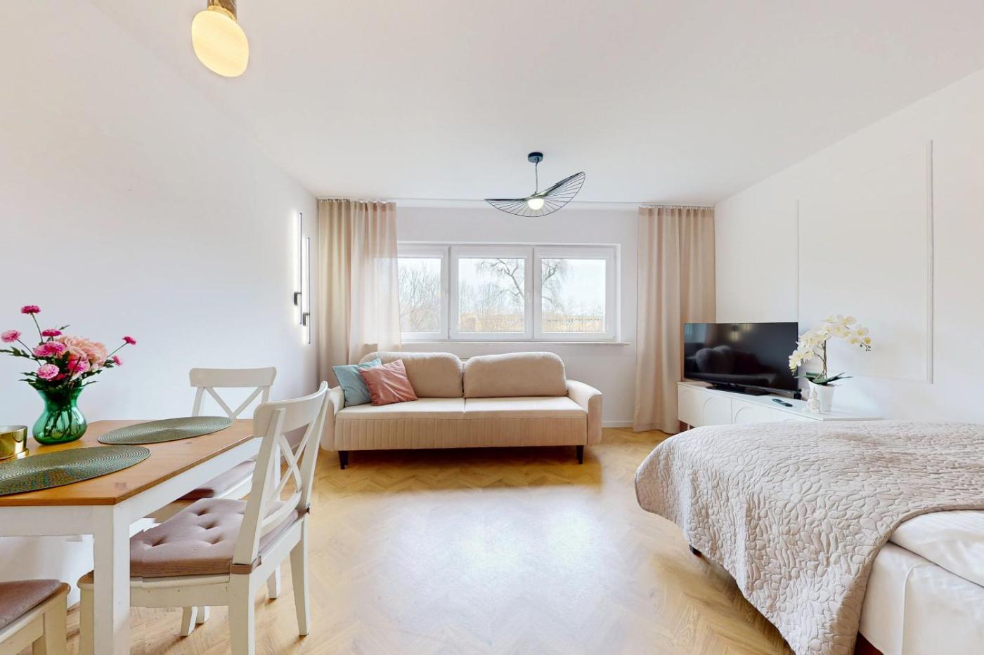 Studio. The studio features a private bathroom equipped with a bath or a shower and a hairdryer. In the kitchen, guests will find a stovetop, a refrigerator, a dishwasher and kitchenware. The studio offers a washing machine, a private entrance, a tea and coffee maker, a wardrobe, as well as a flat-screen TV with cable channels. The unit offers 2 beds. Studio - 4 osobowy. Powierzchnia pokoju ok.: 28 mkw.