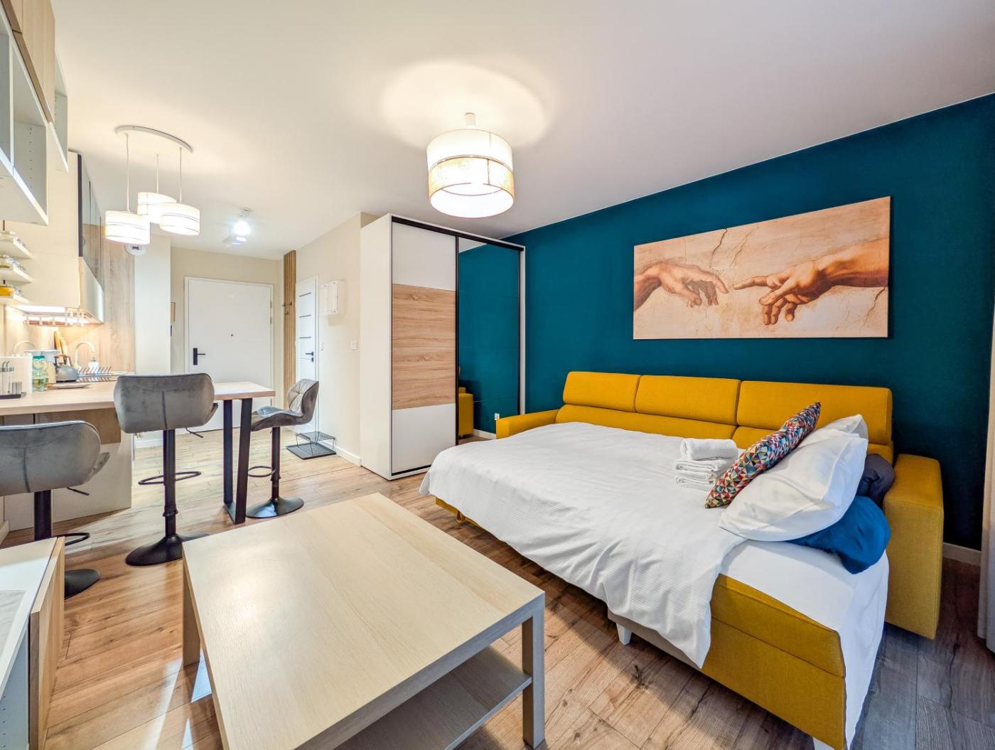 Studio. In the well-equipped kitchenette, guests will find a stovetop, a refrigerator, a dishwasher and kitchenware. The studio offers a washing machine, a tea and coffee maker, as well as a private bathroom featuring a shower and a hairdryer. The unit offers 1 bed. Studio - 2 osobowy. Powierzchnia pokoju ok.: 30 mkw.